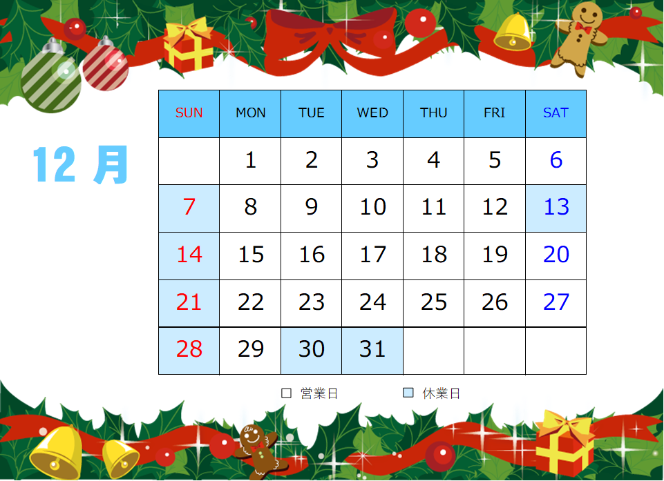 12月の営業日は、下記の通りです。